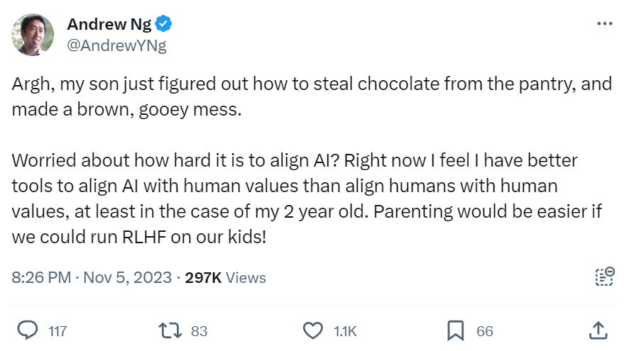 Andrew NG had a great tweet the other day, noting how it is sometimes much easier to align a Machine with Human Values than it is to align a Human (a toddler in his case) with Human Values
